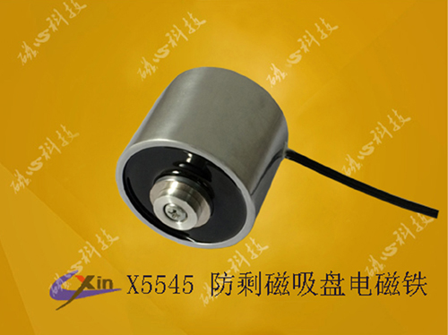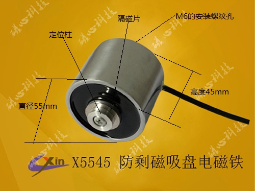 X5545防剩磁吸盤電磁鐵屬于微型直流吸盤式電磁鐵,電磁鐵廠家研發(fā)、生產(chǎn)的防剩磁吸盤電磁鐵X5545具有大吸力的同時(shí)可以有效的把剩磁降低至5克之內(nèi),產(chǎn)品的直徑為55mm,高